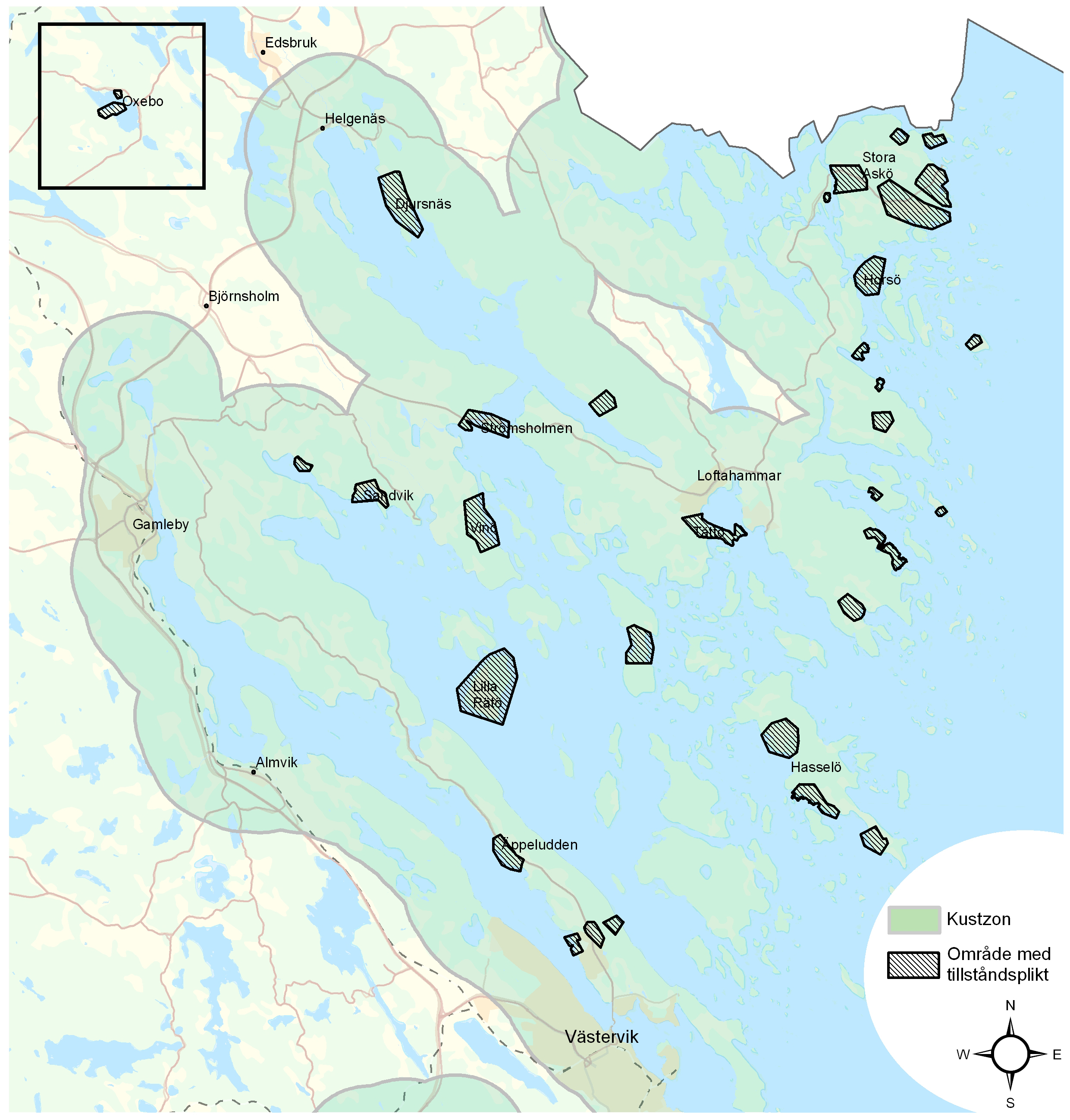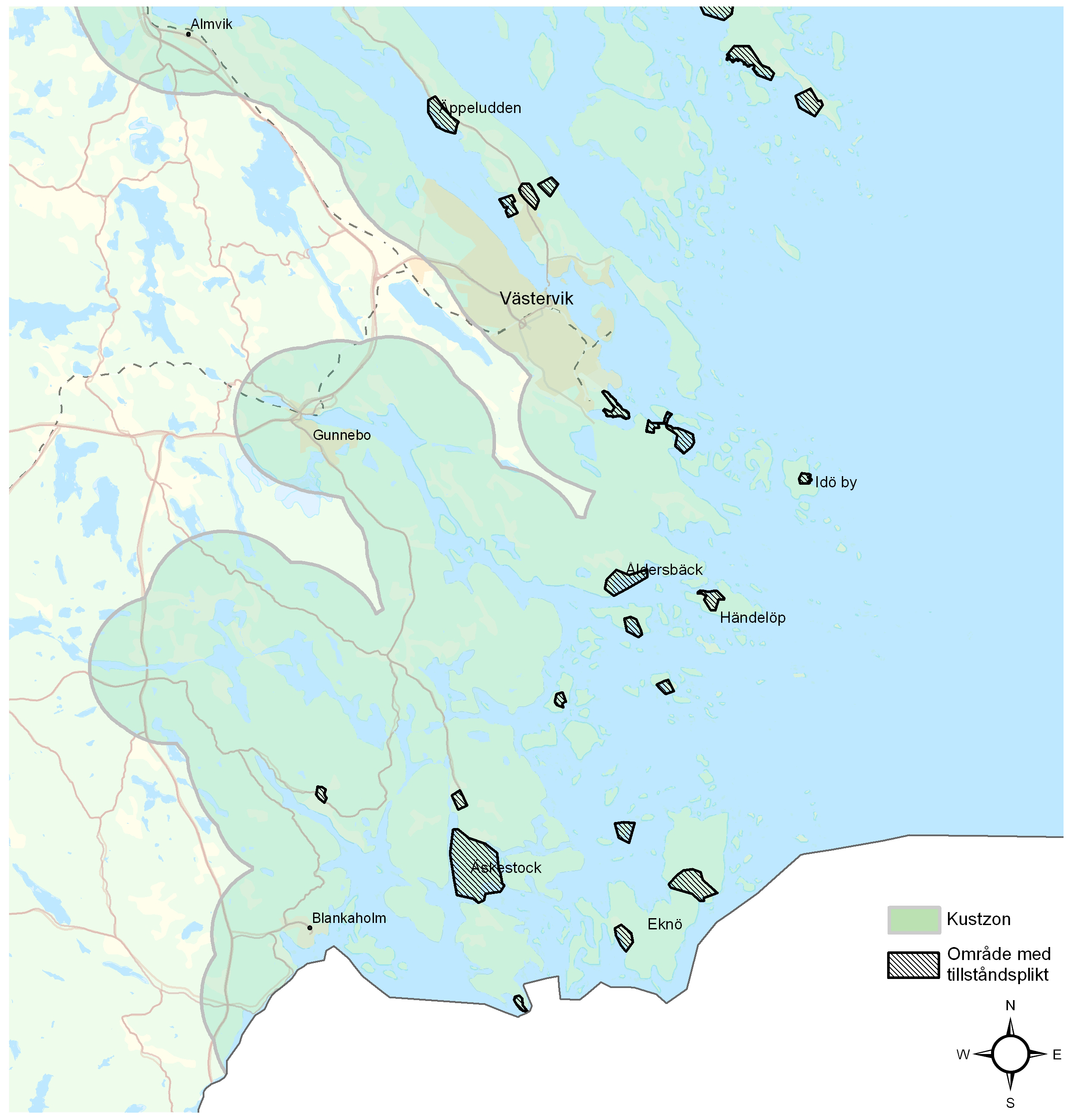 För mer information om vilka områden som detta gäller för se "Lokala hälsoskyddsföreskrifter" under relaterade dokument på denna sida. Kartbilaga 1 visar vilka områden som omfattas av tillståndsplikt respektive anmälningsplikt. Inom områden som är markerade som kustzon behöver du lämna in en anmälan för att få borra en brunn. Inom streckade områden gäller tillståndsplikt.