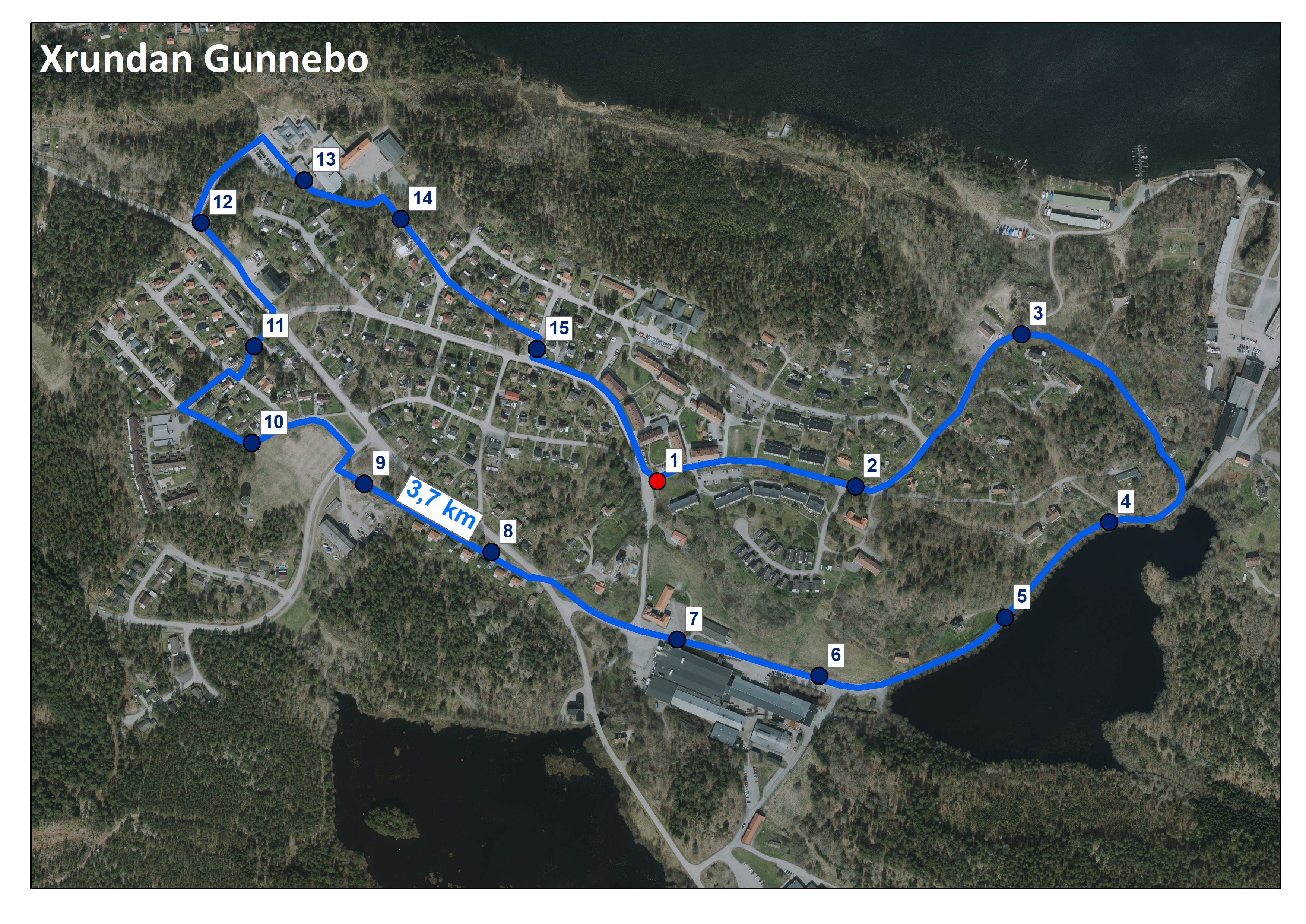 Starten för rundan är i korsningen vid centrum. Den går medurs och är cirka 3,7 kilometer lång. Terrängen består av asfalt.